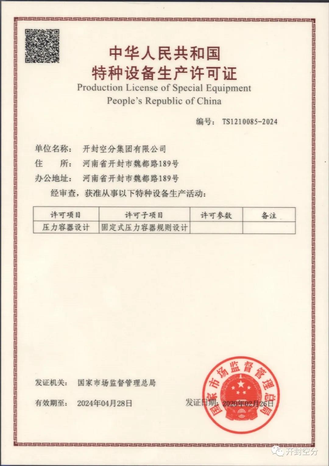 近日,公司正式取得固定式壓力容器規(guī)則設(shè)計(jì)許可證!